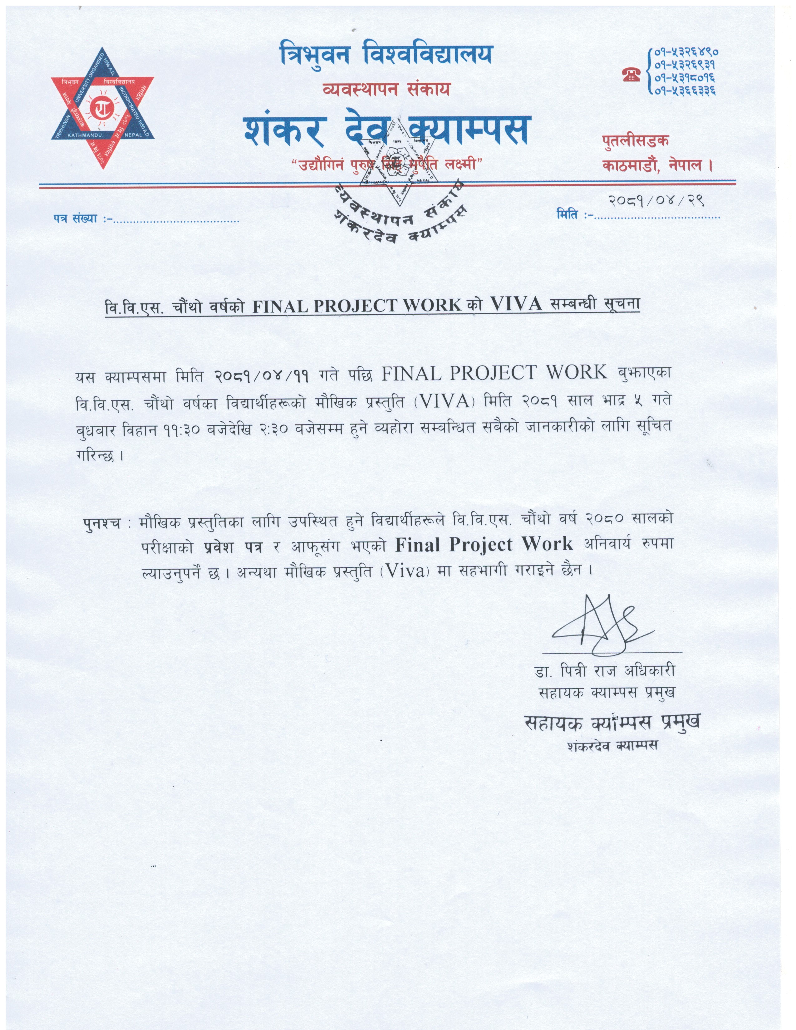वि.वि.एस. चौंथो वर्षको FINAL Project Work को VIVA सम्बन्धी सूचना