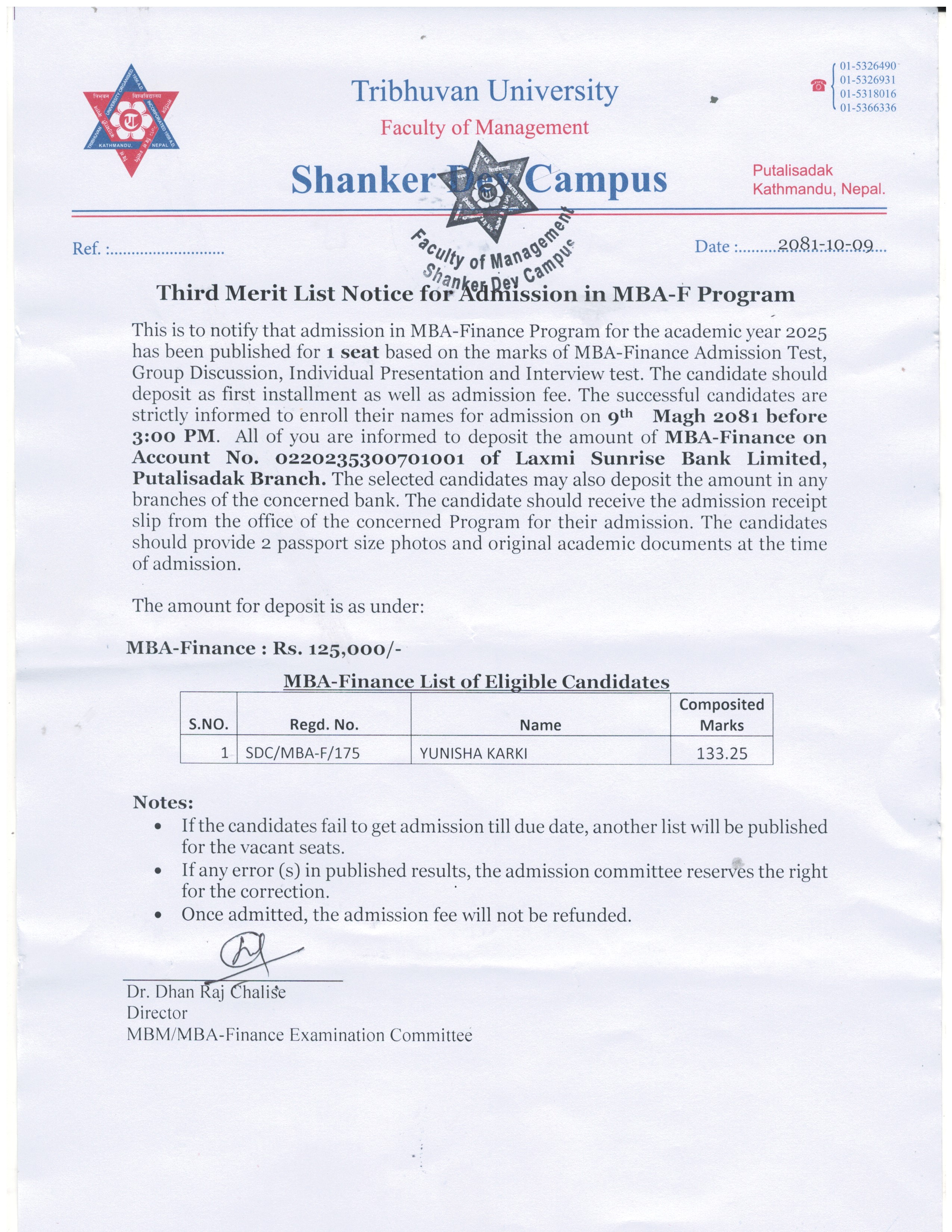 Admission List for MBA-Finance ,MBM and MITM Progr...