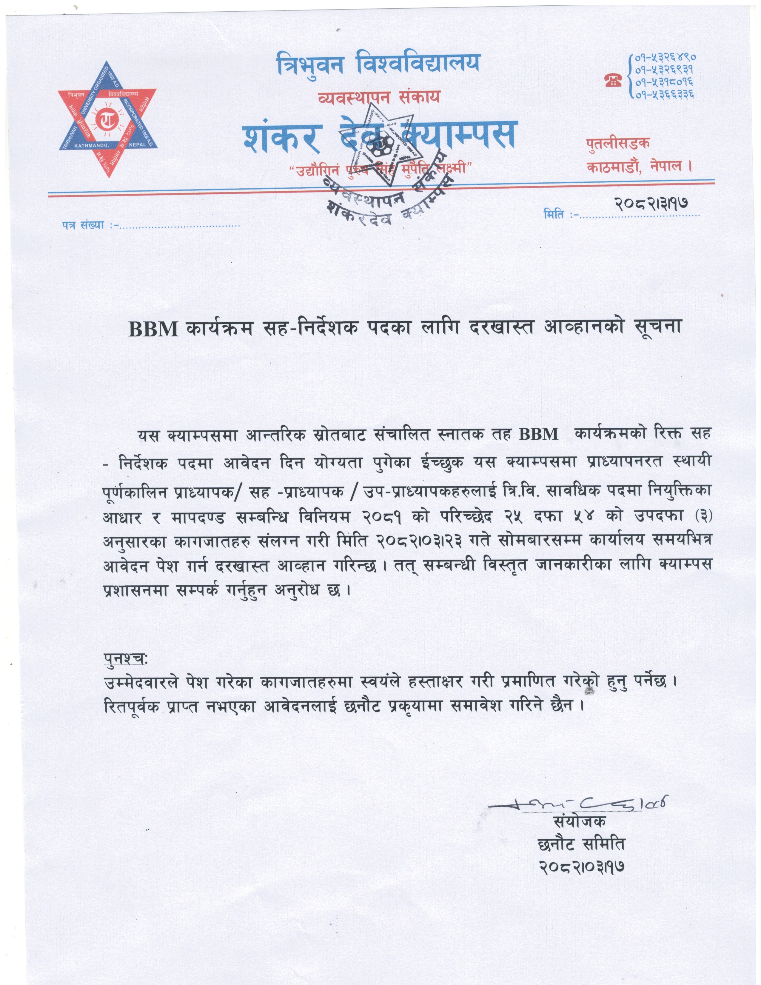 BBM कार्यक्रम सह-निर्देशक पदका लागि दरखास्त आव्हानकाे सूचना