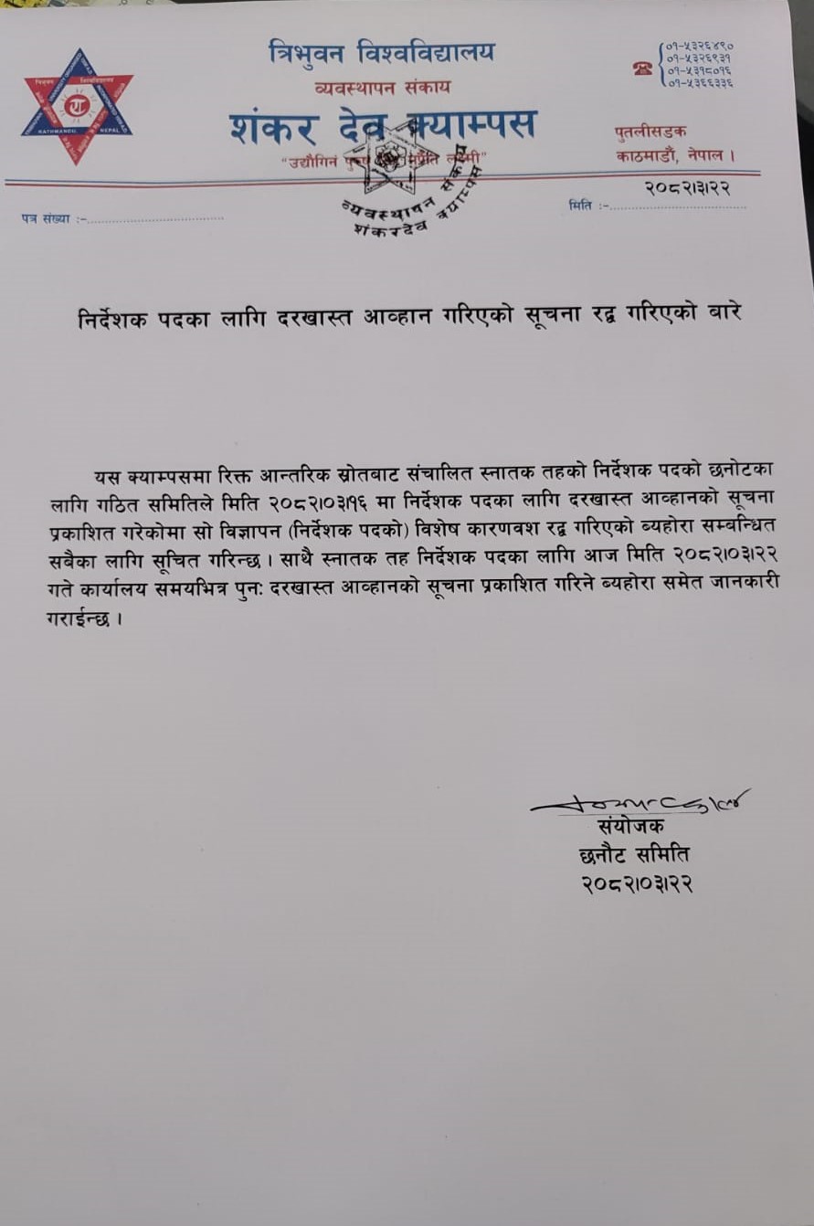 निर्देशक पदका लागि दरखास्त आव्हान गरिएकाे सूचना रद्द गरिएकाे बारे