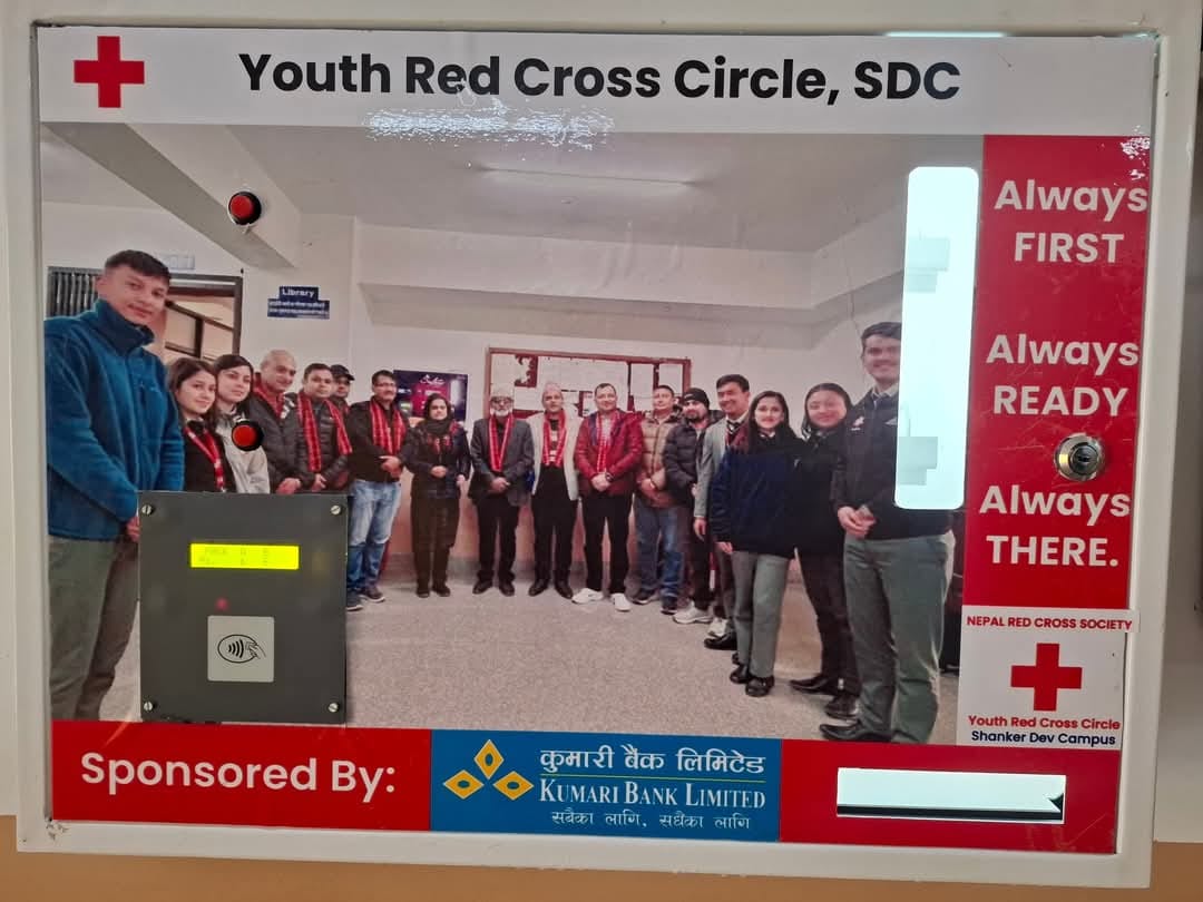 The Youth Red Cross Circle of Shanker Dev Campus has, for the first time, distributed free sanitary pads to the female students of the campus in the leadership of YRC SDC President Mr. Sameer Basnet. This initiative has been launched with a special focus on the health and dignity of the female students studying at the campus. With financial support from Kumari Bank Limited, Putalisadak, as well from the ex. Student of BBM 2076 batch the Youth Red Cross Circle Shanker Dev campus has installed three sanitary pads vending machines and provided 500 packets of sanitary pads.