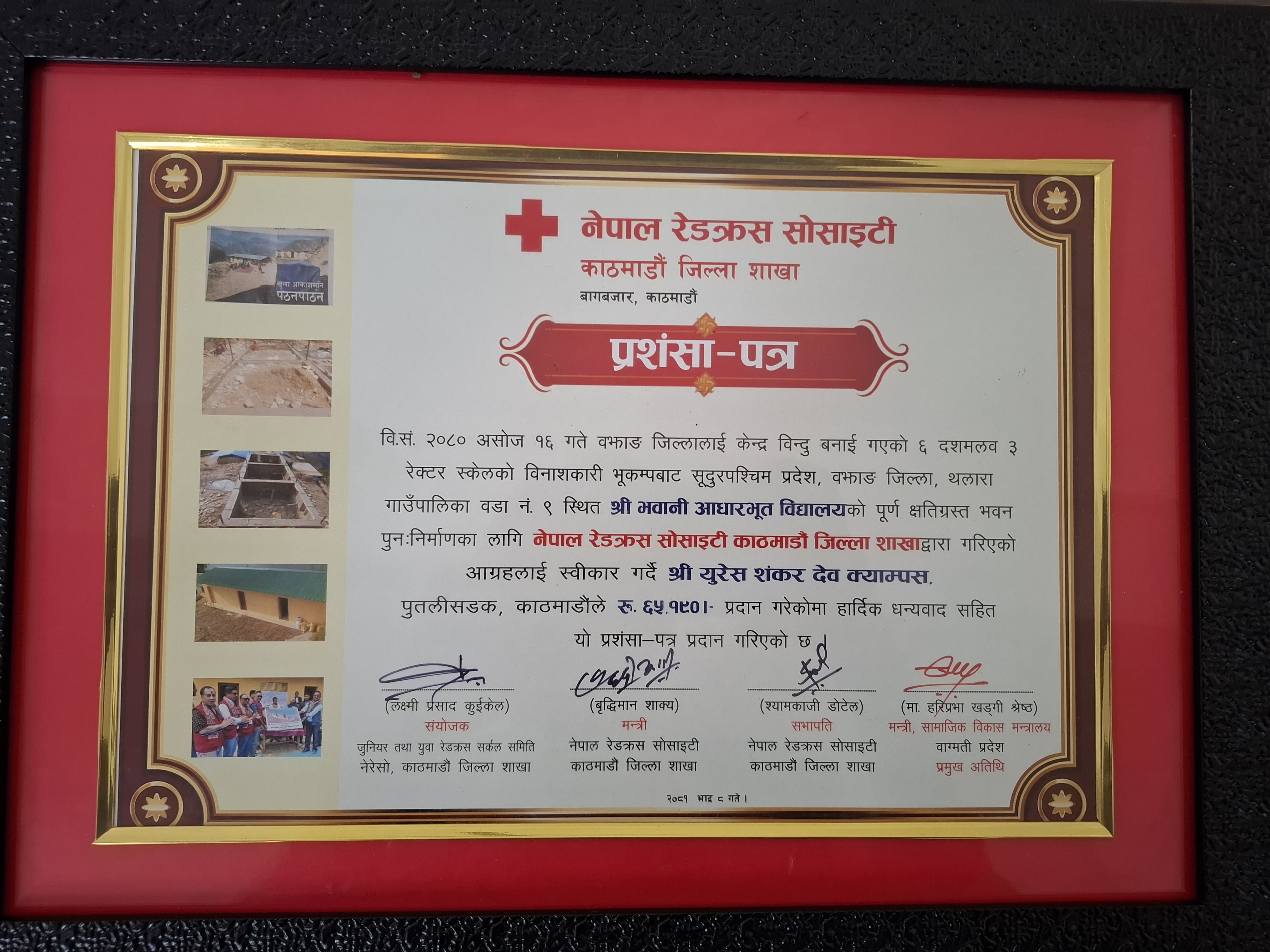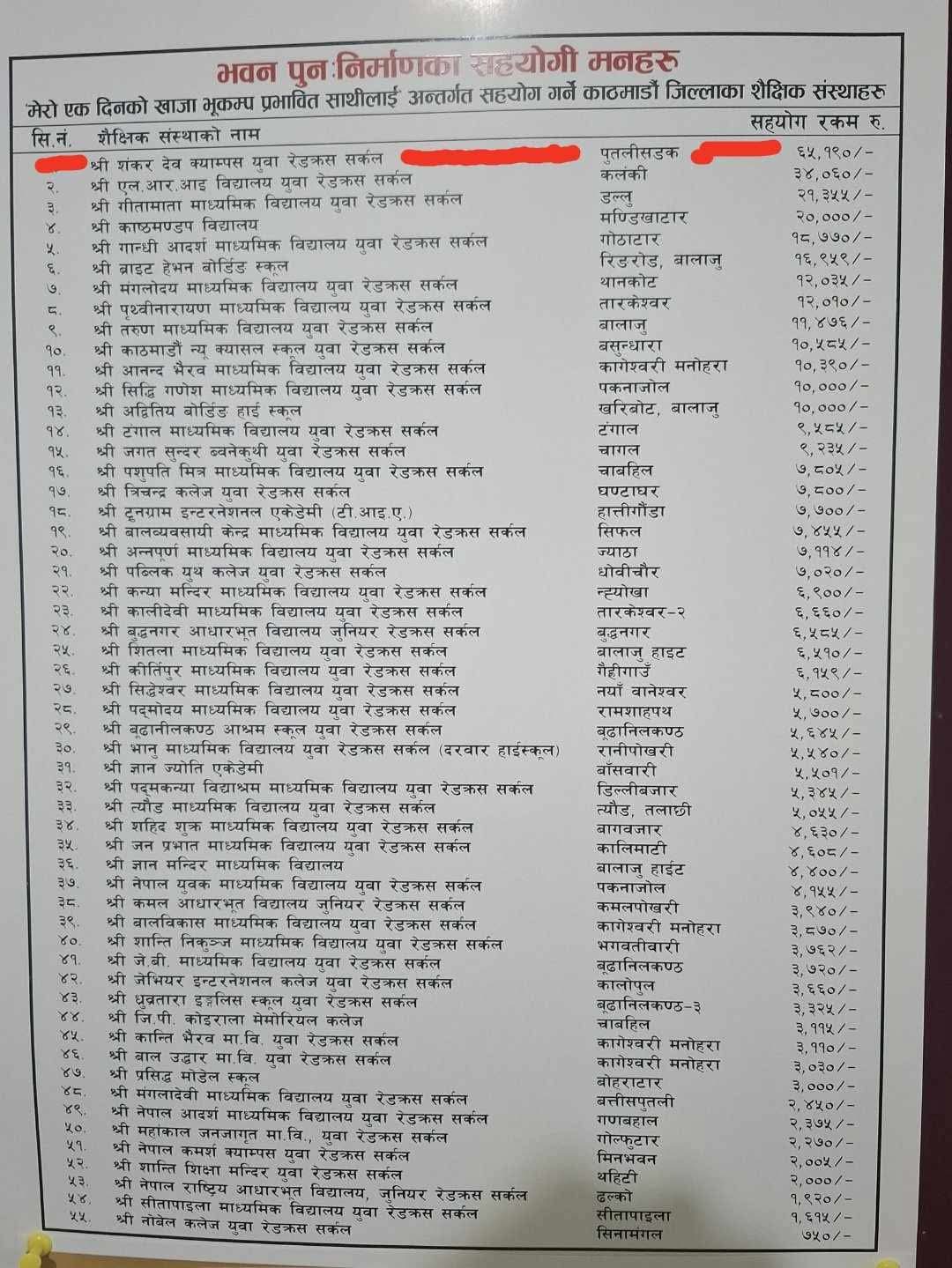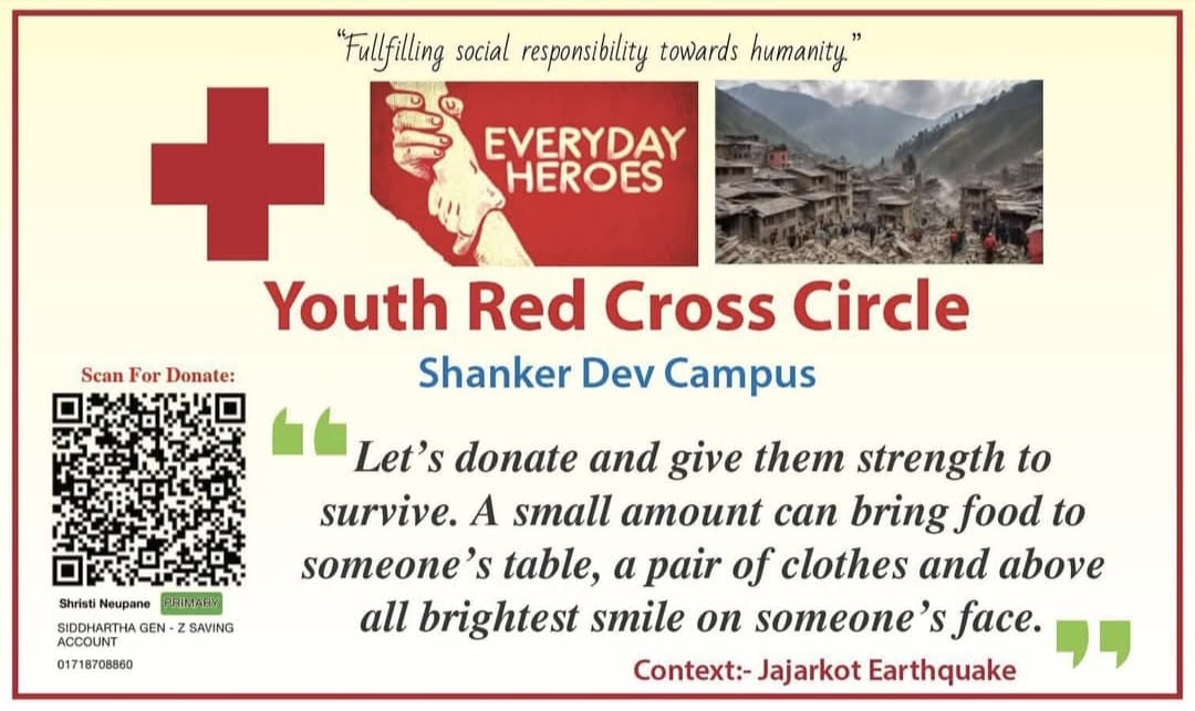 Through the "My One Day’s Snack for Earthquake-Affected Friends" campaign initiated by the Nepal Red Cross Society, Kathmandu District Branch, the Youth Red Cross Circle of Shankar Dev Campus successfully raised and handed over NPR 65,190. This heartfelt support was collected by our fellow students and will go towards rebuilding a classroom building at Shree Bhawani Basic School in Bajhang district — one of the areas devastated by last year's tragic earthquake in Sudurpaschim Province, with Bajhang as the epicenter on Ashoj 16, 2080 earthquake.